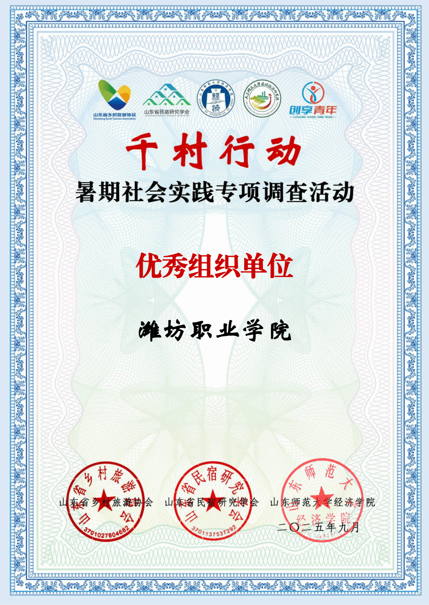 近日,2025年“千村行动”暑期社会实践专项调查活动结果公布,我院2篇调查报告获优秀调查报告二等奖,3名教师获优秀指导教师称号,米乐(中国)获评优秀组织单位。2025年“千村行动”由山东省乡村旅游协会、山东省民宿研究学会、山东师范大学经济米乐(中国)、山东师范大学县域经济研究院联合开展,旨在借助征文、短视频、调查报告等多样形式,记录乡村蜕变轨迹,探寻乡村振兴路径,增强青年学子服务乡村的责任意识与实践能力,推动乡村全方位振兴。...更多 -