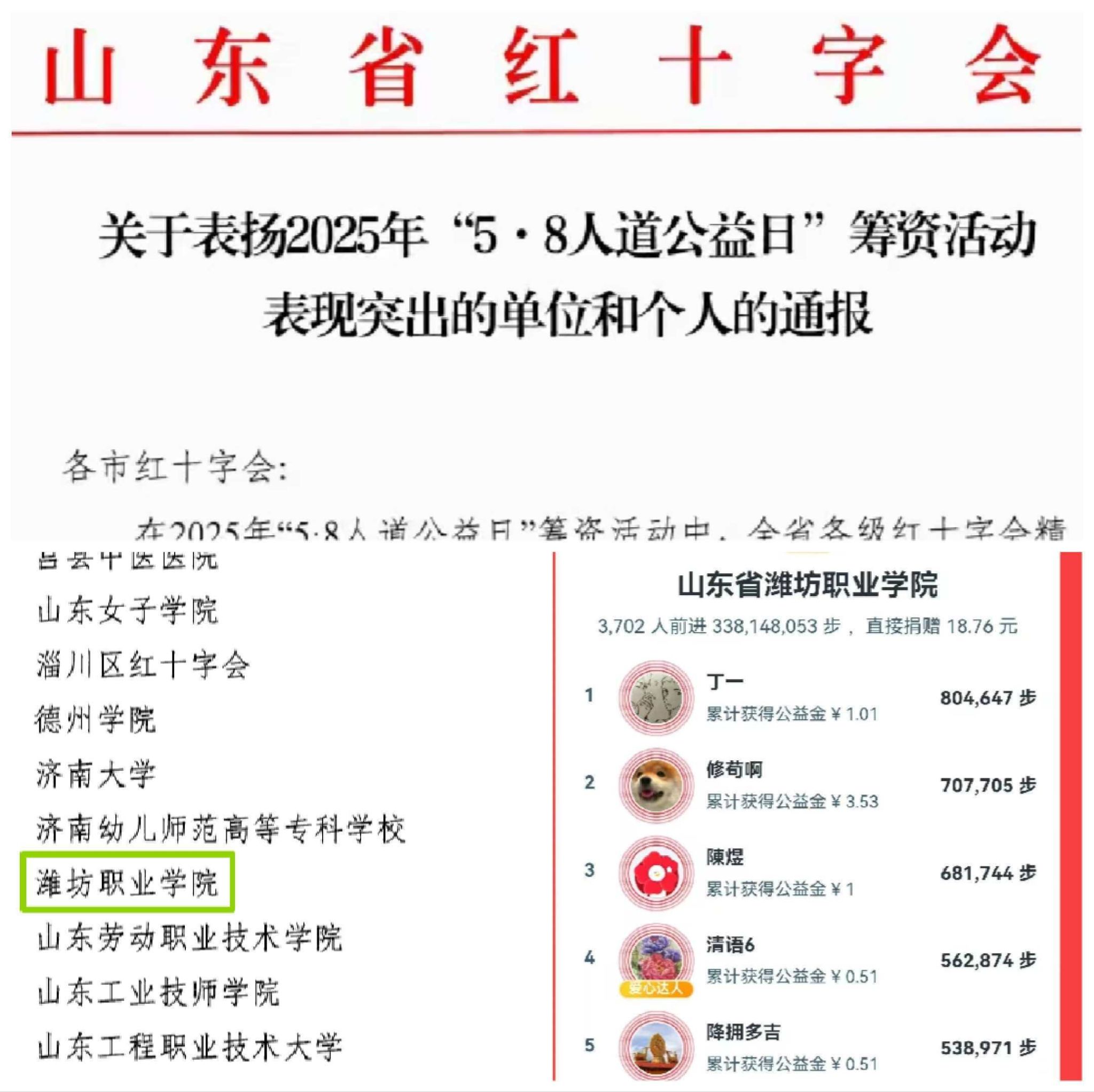近日,山东省红十字会发布《关于表扬2025年“5·8人道公益日”筹资活动表现突出的单位和个人的通报》,我院被选为2025年“一块走”捐步活动表现突出单位。在2025年“5·8人道公益日”筹资活动中,我院积极响应潍坊市和山东省红十字会有关要求,大力弘扬“人道、博爱、奉献”的红十字精神,组建米乐注册“一块走”小队,组织发动广大师生参与“一块走”捐步公益活动。米乐(中国)3702名师生积极行动,前进3.38亿步,捐步排名进入全国百强(...更多 -