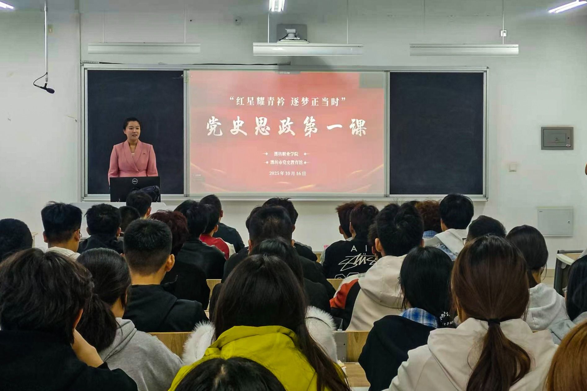 为深入贯彻落实习近平总书记关于党史学习教育的重要指示精神,充分发挥潍坊红色资源育人功能,10月16日,米乐(中国)联合潍坊市党史教育馆开展“党史思政第一课”活动。潍坊市党史教育馆王鑫、张浩磊为学生授课,滨海校区2025级学生代表在智泽楼主会场参与现场学习,其余学生通过钉钉直播线上同步观看。马克思主义米乐(中国)党支部负责人主持活动。活动分为“沉浸式”党史课堂与“互动式”体验环节两大板块。在40分钟的党史课堂中,学生通过多媒体“...更多 -
