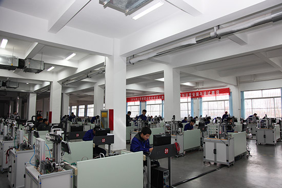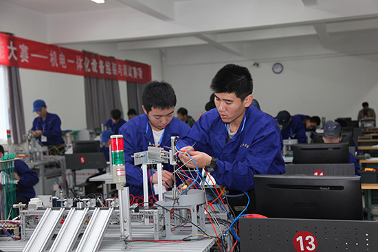 机电一体化设备组装与调试竞赛现场,参赛选手有的在熟练地进行自动生产线的组装,有的在忙碌地进行设备调试,有的在计算机上聚精会神的编制程序,还有的在认真整理项目资料,表现出娴熟的操作技能水平。