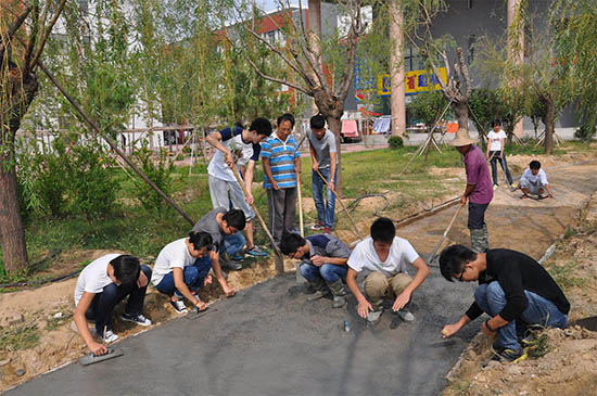 本次教学实训结合滨海校区园林建设,实行校企融合的方法,从施工图设计、材料准备到工程施工,以“学生主体、教师指导”的方式完成校园绿地的园林工程施工,使学生“干中学、学中做”,实现了“工地就是课堂、师生就是员工”的教学安排。两周的实训中,任课教师全程指导,学生全员参加并进行考核。实训共完成铺筑园路500m2、砌筑水池两个,施工工艺符合国家及省市有关标准与规定。
