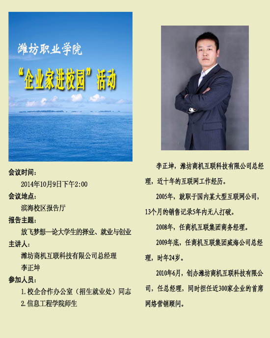 “企业家进校园”活动之三十六:潍坊商机互联科技有限公司总经理李正坤报告会