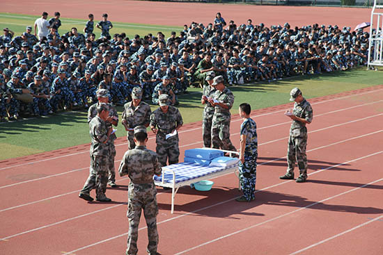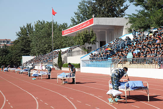 9月10日下午,2014级新生军训内务比赛在奎文校区体育场举行。军训团领导、团委学生工作处负责同志、各二级米乐(中国)负责同志、辅导员(班主任)及2014级新生观看了比赛。