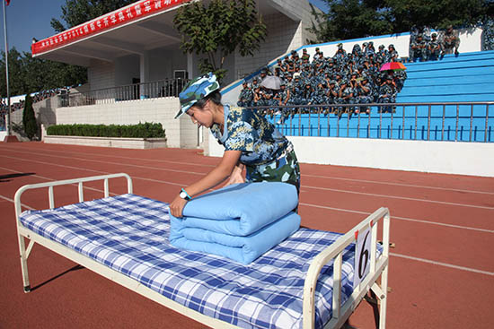 军训内务主要包括整理床铺、按规定放置物品等项目,比赛分8组,共有72名2014级新生参加比赛。比赛现场紧张有序、气氛热烈,选手们铺垫、展褥、平整床单、叠被,摆放毛巾、脸盆、马扎等物品,动作娴熟,以优异的比赛成绩对军训期间的内务学习作了一次完美汇报。