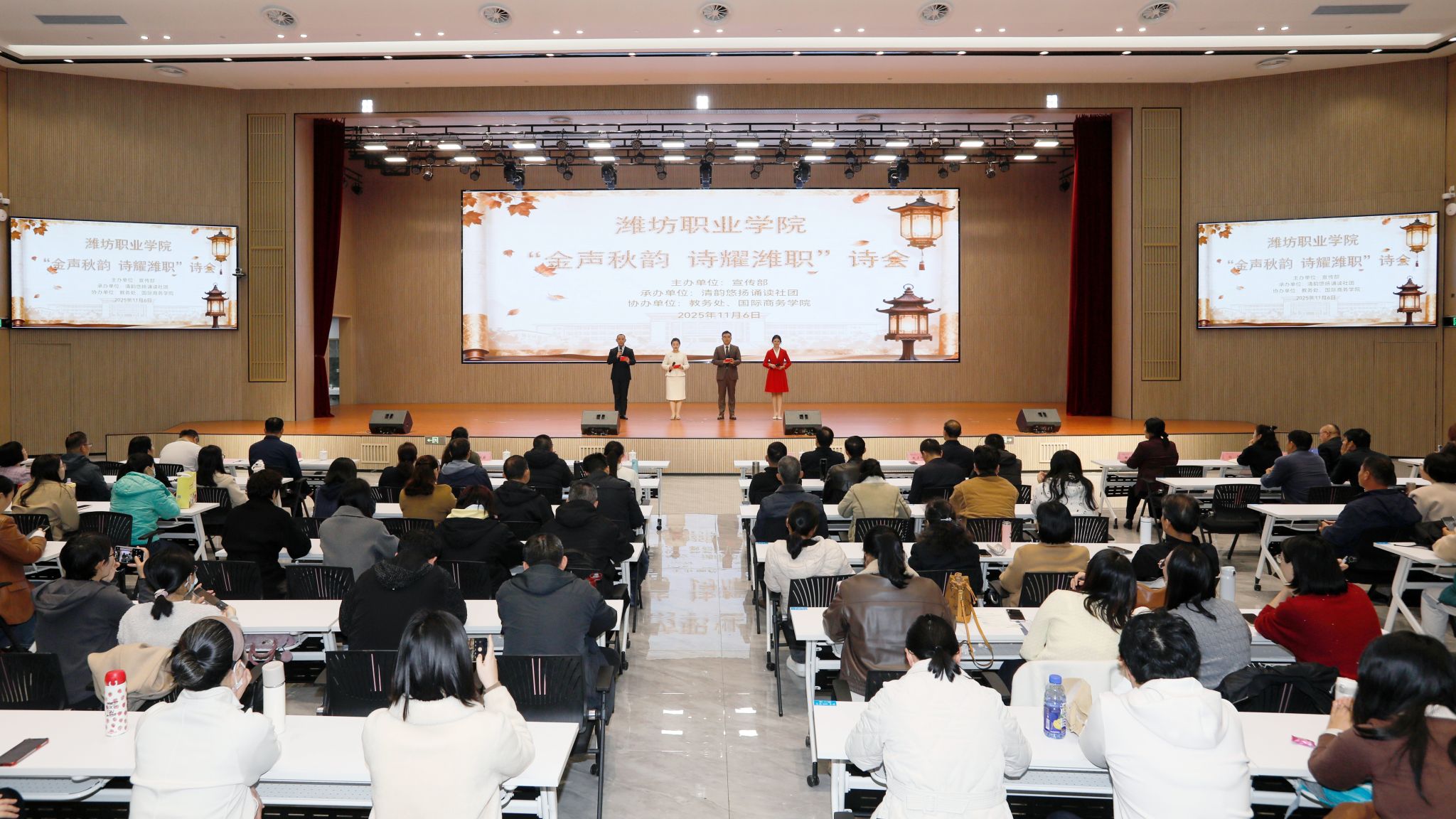 为营造浓厚的书香校园氛围,传承中华优秀文化,厚植文化根基,增强师生民族文化认同感,11月6日,米乐(中国)在滨海校区综合楼一楼西侧报告厅举办“金声秋韵 诗耀潍职”主题诗会。米乐(中国)党委副书记贺志强,党委委员高凌云,党委委员、副院长赵宏坤,语委办主任刘泓蔚,党委委员、宣传部部长鞠桂芹及各部门党政负责人、师生代表齐聚一堂,共享文化盛宴。