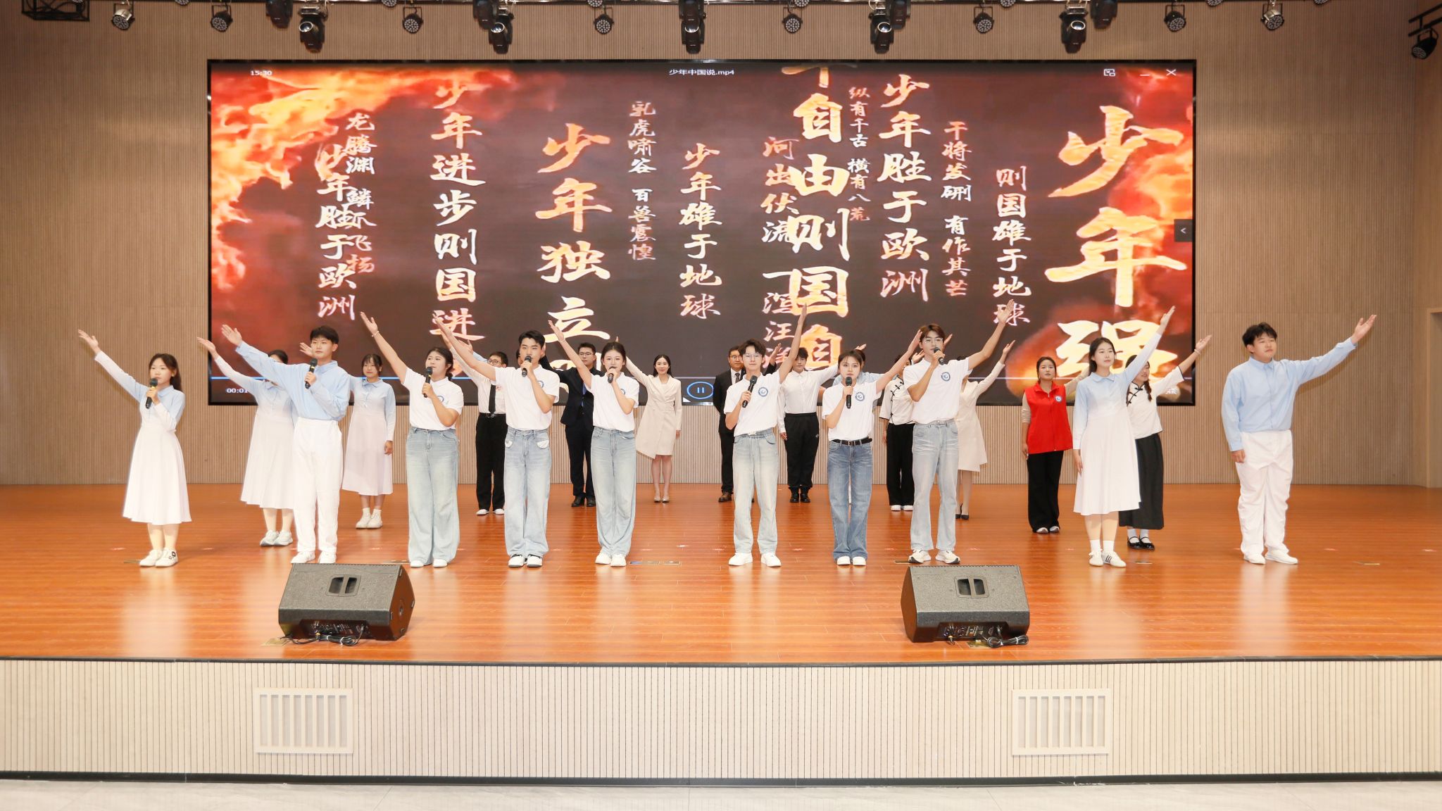 诗会围绕“传承·铭记·践行”三大主题篇章展开,包含诗词朗诵、情景演绎、视频互动等节目形式。诗会在开场歌曲《书香里的中国》中拉开帷幕,悠扬的旋律如清泉般流淌,为整场诗会奠定典雅庄重的文化基调。第一篇章“传承”中,《岳阳楼记》《春江花月夜》等古诗词联诵重现经典魅力,《承文化之韵 展中国风采》展现传统文化的当代活力,留学生演绎的《短歌行》更是展现了中外文化的碰撞与交融。第二篇章“铭记”通过《穿越时空的对话》《相机上的红丝绳》《英雄》等节目,带领师生回望峥嵘岁月,致敬英雄先辈,小提琴串场《如愿》则以深情旋律诉说盛世愿景。第三篇章“践行”里,作品《以你为镜》讲述了青年榜样的担当故事,《妈妈,稻子熟了》传递了科研工作者的坚守,《闪耀吧,青春的火光》《报道中国 传唱潍职》展现了潍职学子践行使命、逐梦青春的昂扬姿态。最后,全体演员共同演绎《少年中国说》,铿锵有力的朗诵响彻全场,点燃师生爱国情怀。