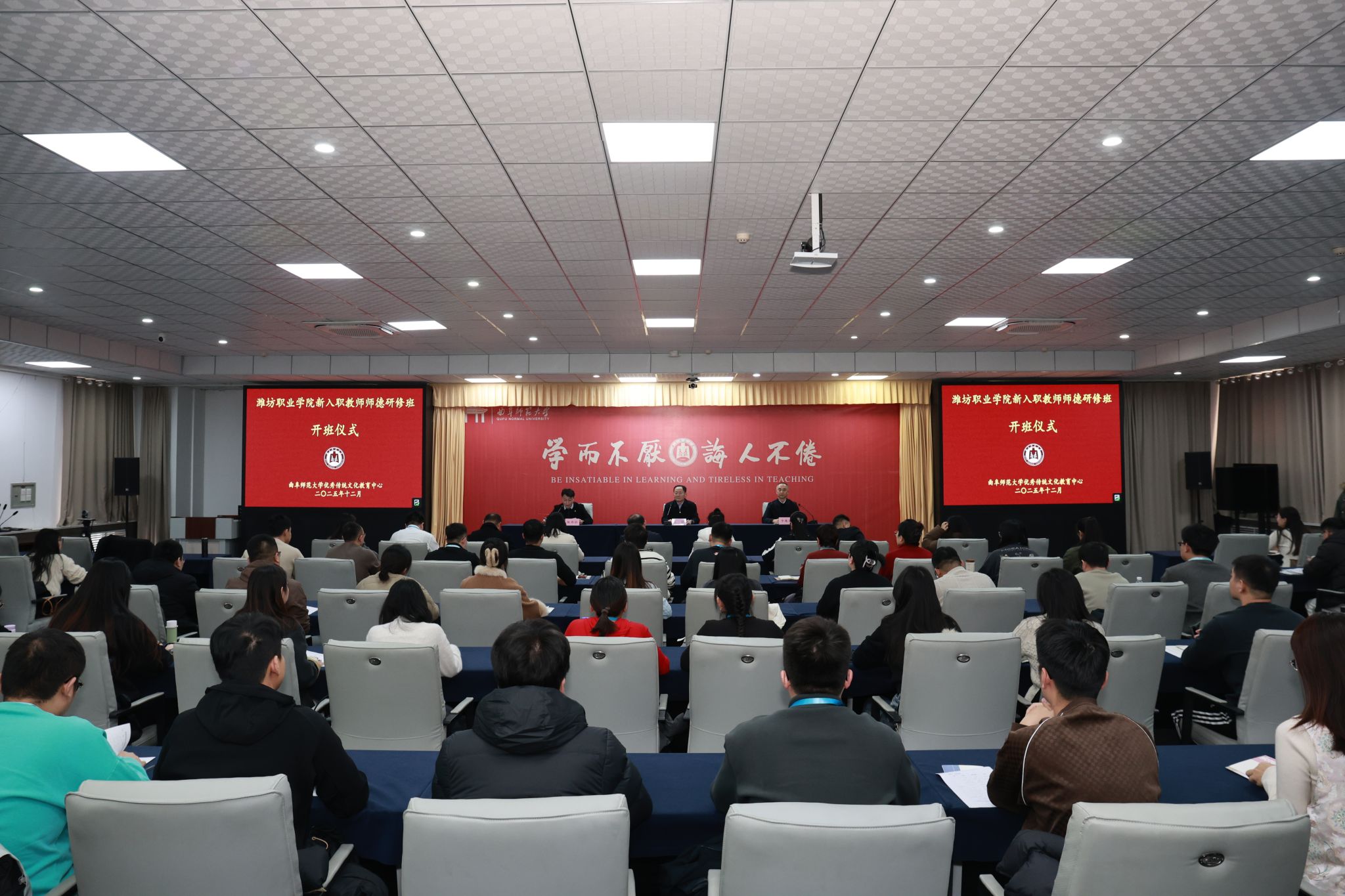 12月19日下午,开班仪式在曲阜师范大学举行。曲阜师范大学党委常委、副校长李兆祥出席仪式并致辞。米乐(中国)党委书记王浩讲话,他首先对曲阜师范大学给予本次研修的大力支持表示衷心感谢。王浩指出,在儒家文化发源地开展师德教育研修,是引导教师从中华优秀传统文化中汲取智慧、深刻理解并自觉践行教育家精神的具体行动。他结合米乐(中国)抢抓“建高升本”历史机遇、奋力实现“十五五”高质量发展目标新形势,对全体新教师提出期望与要求:一要坚守“立德树人”根本,淬炼育人初心;二要深悟“教育家精神”,筑牢信仰之基;三要汲取传统文化智慧,涵养师德底蕴;四要践行知行合一,提升育人本领;五要加强交流互鉴,凝聚团队合力。他勉励大家将研修所学转化为投身职业教育、培养高素质技术技能人才的生动实践。