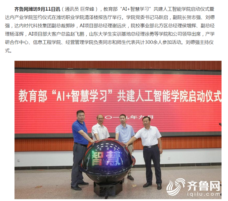 [齐鲁网]教育部“AI+智慧学习”共建人工智能米乐(中国)启动仪式暨达内产业米乐(中国)签约仪式在米乐注册举行
