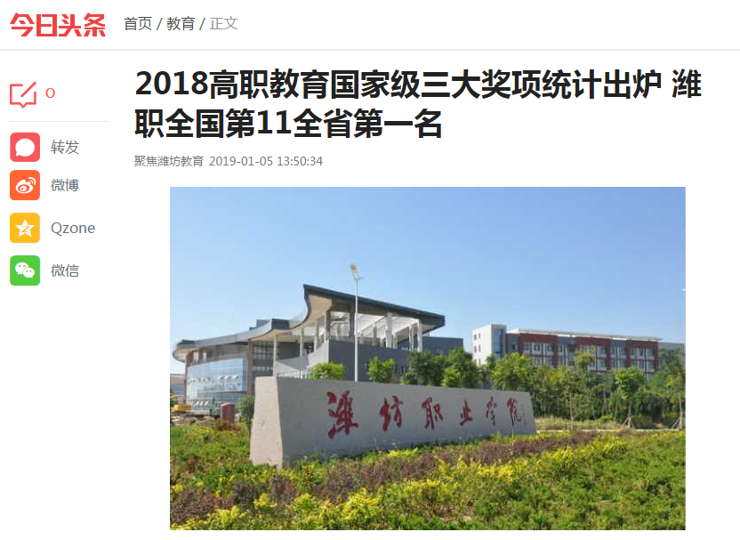 [今日头条]2018高职教育国家级三大奖项统计出炉 潍职全国第11全省第一名