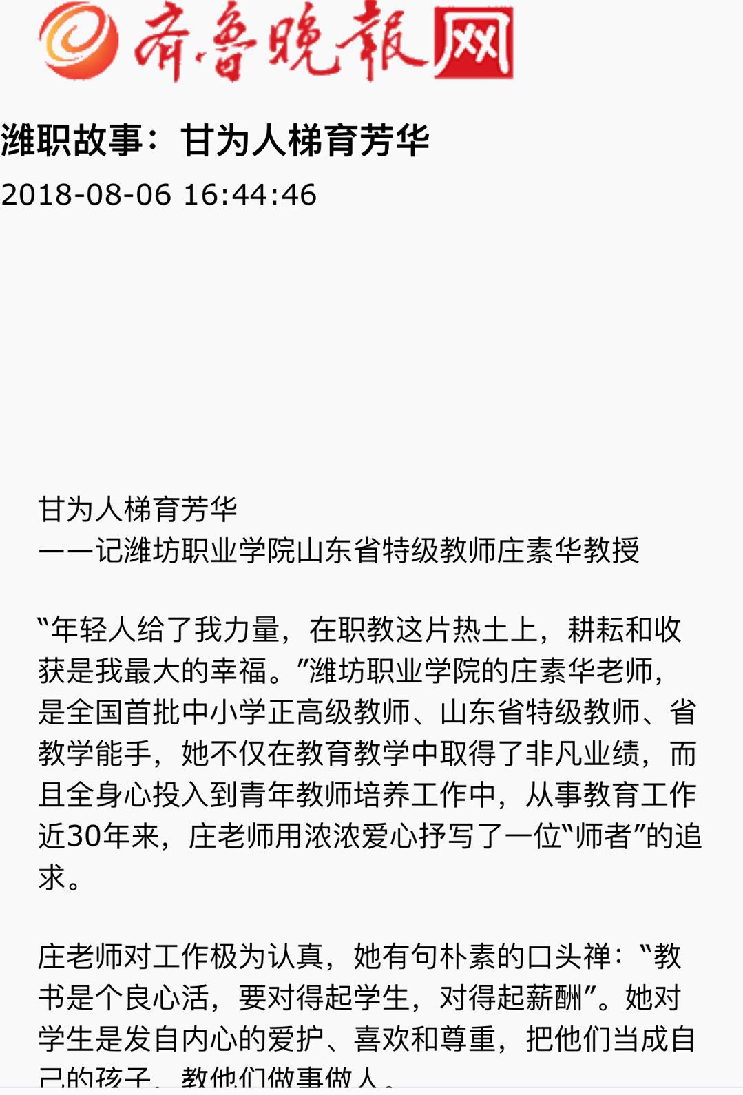[齐鲁晚报]甘为人梯育芳华——记米乐注册山东省特级教师庄素华教授