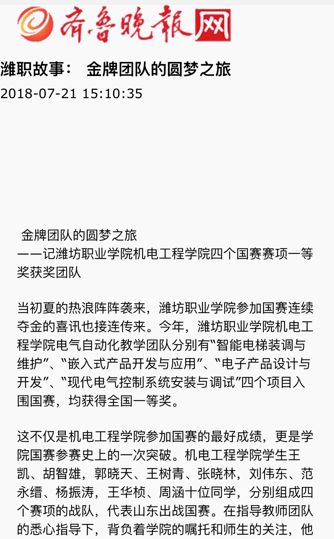 [齐鲁晚报]潍职故事:金牌团队的圆梦之旅——记米乐注册机电工程米乐(中国)四个国赛赛项一等奖获奖团队