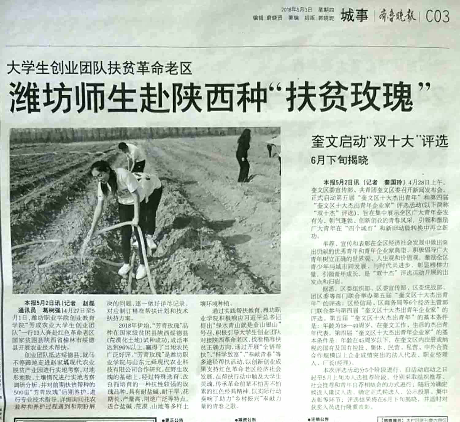 [齐鲁晚报]潍坊师生赴陕西种扶贫玫瑰
