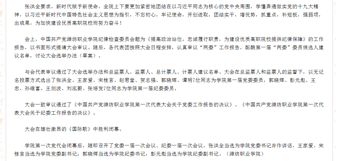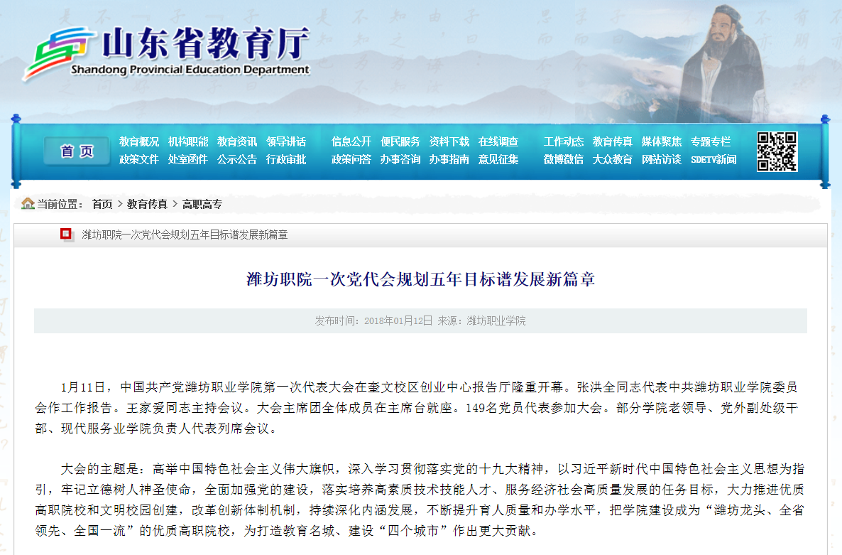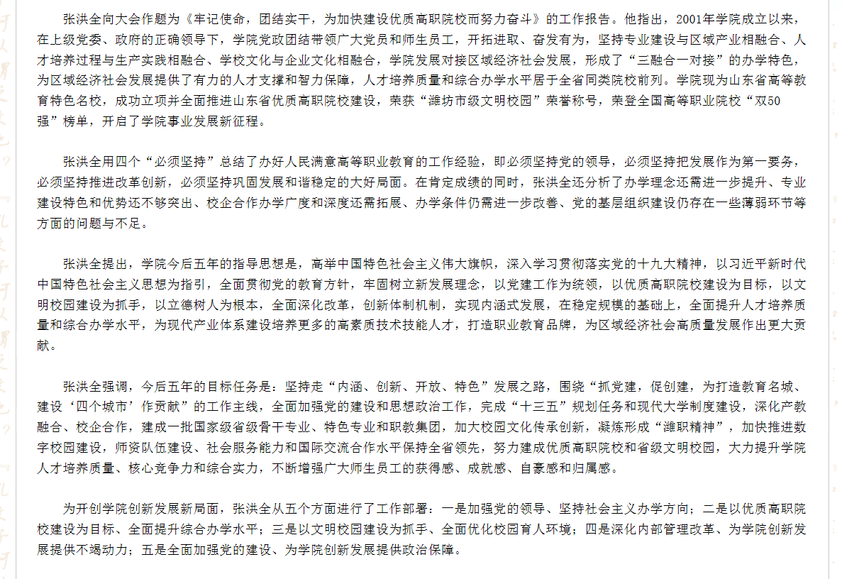 [山东省教育厅]潍坊职院一次党代会规划五年目标谱发展新篇章