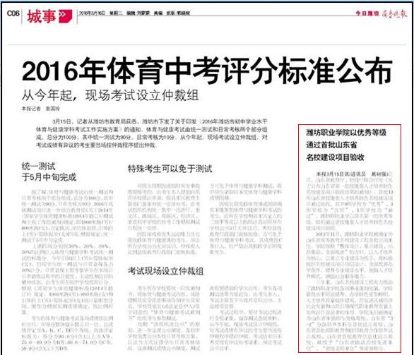 本报3月15日讯(通讯员 葛树强)近日,山东省教育厅、财政厅联合印发《关于公布山东省第一批技能型人才培养特色名校建设项目验收结果的通知》,首批13所山东省技能型人才培养特色名校建设项目通过验收,其中9所学校为“优秀”、3所学校为“良好”、1所学校为“通过”,潍坊职院业学以排名第一的优秀等级,顺利通过省技能型人才培养特色名校建设项目验收。