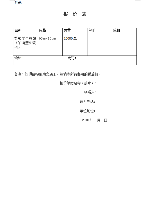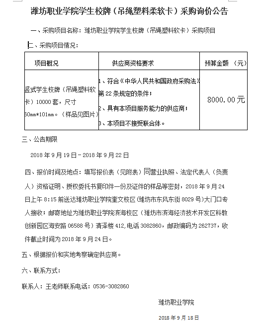 米乐注册学生校牌(吊绳塑料柔软卡)询价公告