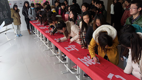 3月8日失联的马航MH370航班牵动着亿万人的心,国际商务米乐(中国)于3月13日上午举行了“心系马航,为爱祈福”签名活动,同学们纷纷表达了自己对失联飞机MH370航班的关注和祝福。条幅上除了师生们的签名,还写满了祝福的话语。韩国外教和部分教师也与同学们一起参加了签名活动。(黄言青供稿)