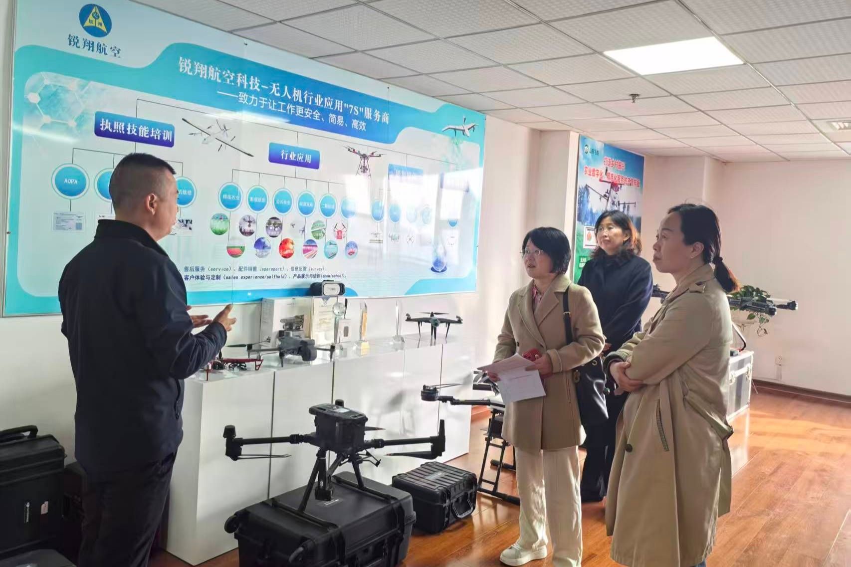 在锐翔航空无人机实训基地,调研团队实地观摩了物流无人机精准配送演示,系统了解了企业无人机驾驶培训体系及“研发制造-应用服务-人才培养”的闭环生态布局,并就不同场景下无人机物流适配方案、人才培养核心需求等问题与企业方展开针对性交流,明确产业端对专业教学的实际要求。