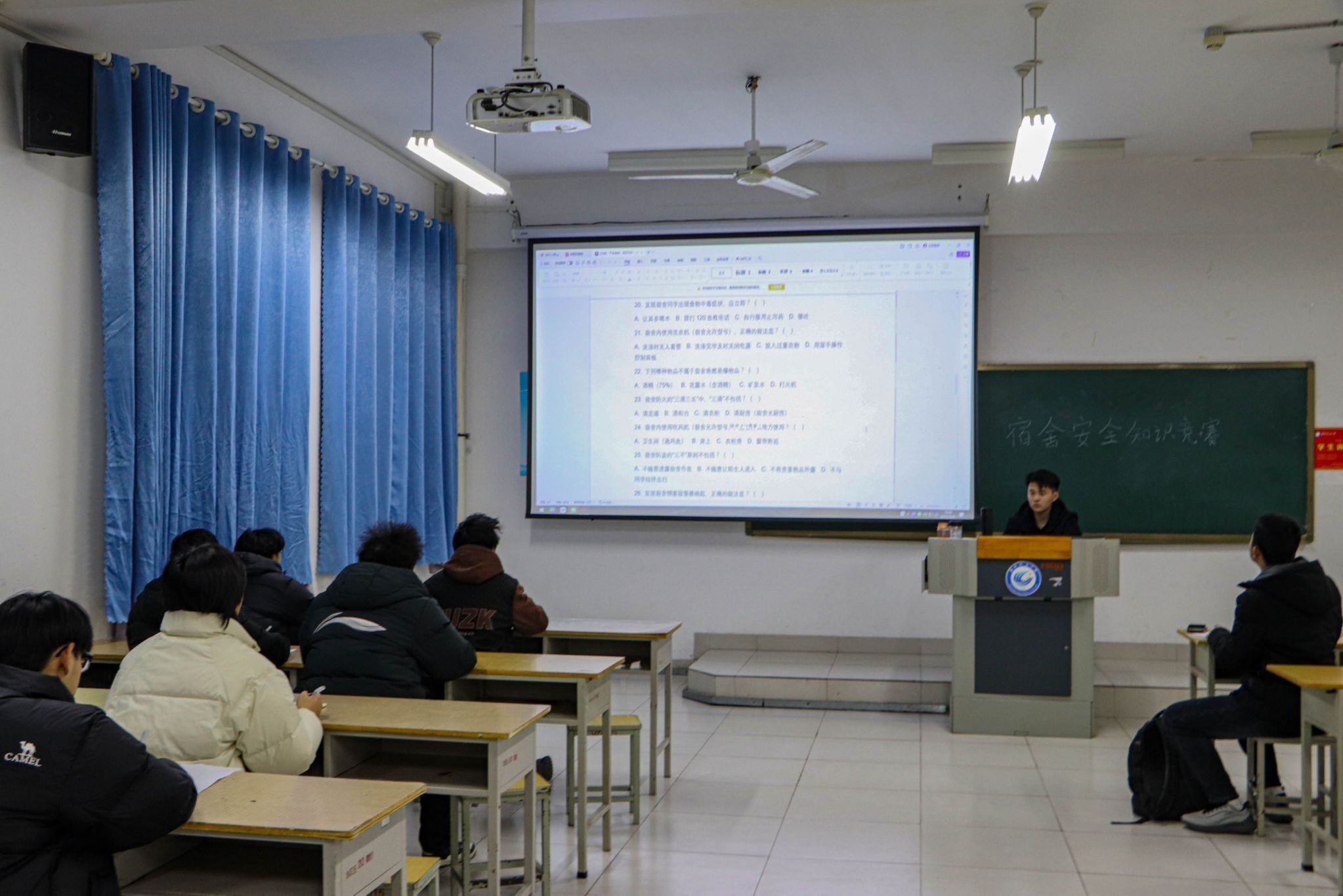 本次竞赛以“筑牢安全防线,共建平安家园”为主题,各班级经过前期选拔,共组成八支代表队进入最终决赛。竞赛内容紧扣宿舍生活实际,涵盖消防安全、用电安全、财物安全、交通安全、防灾避险、应急处理以及校规校纪等多个方面。比赛现场气氛紧张热烈,秩序井然。在必答题环节,各队选手准备充分,对答如流,展现了扎实的安全知识基础。情景模拟题通过再现宿舍中可能遇到的突发安全场景,考查选手们的临场判断与应急处置能力。活动最终评选出一等奖1名、二等奖2名、三等奖5名。