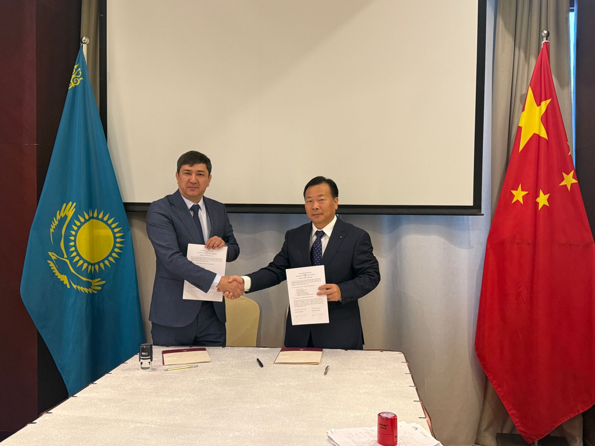 在哈萨克斯坦期间,代表团先后访问了贾母布尔高等理工米乐(中国)、阿斯塔纳高等理工米乐(中国)、中国电力建设集团哈萨克斯坦代表处、哈萨克斯坦中国总商会等多所高校、企业及机构。在贾母布尔高等理工米乐(中国),校长阿斯哈特、贾姆布尔州教育局科教部主任阿伊巴尔先生等热情接待代表团,双方正式建立友好合作关系并举行签约仪式,计划近期启动化学工程领域师生交流和技术培训项目。在阿斯塔纳高等理工米乐(中国),代表团与副校长阿瑟玛等举行会谈并签署合作意向书。在中国电力建设集团,双方围绕“中文+职业技能”培训需求开展深入交流,就共同培养具备中文沟通能力和专业技能的本土人才达成合作共识。在哈萨克斯坦中国总商会,代表团了解在哈中资企业对各领域技术技能人才的需求情况,为后续推进学生海外实习与本地员工培训找准方向。