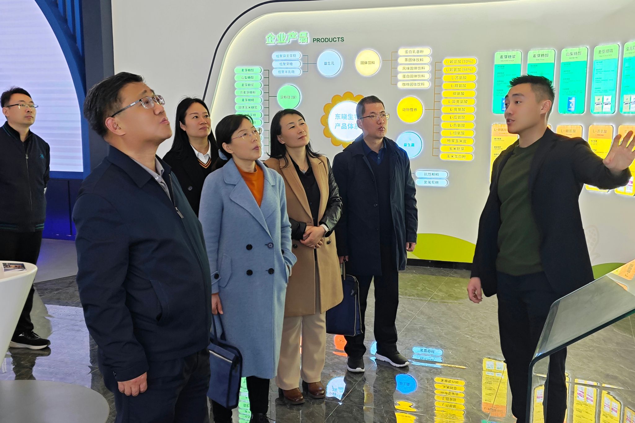 在诸城外贸有限责任公司副总经理邱立忠陪同下,韩瑞东一行实地参观了企业生产中心、研发中心,详细了解了企业发展历程、发展规划、市场优势;在得利斯股份有限公司副董事长徐勇陪同下,参观了得利斯十万吨肉制品生产项目和企业展馆,详细了解了得利斯创立四十年来在企业文化建设和产品创新方面取得的突出成绩;在东晓生物科技股份有限公司副总经理李天罡陪同下,参观了企业玉米淀粉糖类初级加工中心、核心产品展区,对企业近年来在新型代糖、膳食纤维、动物营养、固体饮料等领域取得的成就有了深入认知。